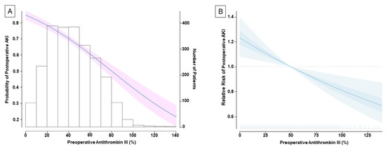 Figure 2. The association between preoperative antithrombin III (ATIII) and postoperative acute kidney injury. The solid line indicates the probability on a continuous scale value, and the shaded areas indicate 95% confidence interval (A). The multivariate-adjusted relative risk plot showing the relationship between preoperative ATIII and postoperative acute kidney injury (B). Estimates are adjusted for independent confounders from multivariable generalized logistic regression model. The solid lines and translucent band depict relative risk and 95% confidence intervals of those estimates.