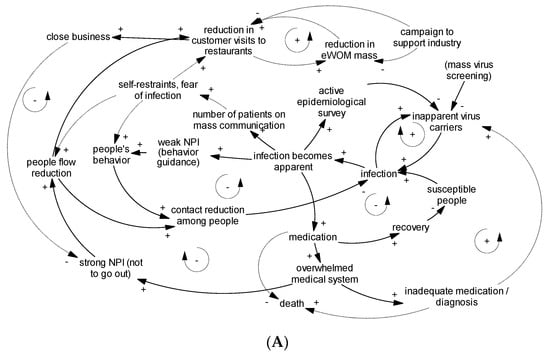 A causal loop diagram related to eWOM is shown in Figure 3E. Reduction in eWOM mass can lead to a reduction in customer visits considering the positive relationship between eWOM and sales [10], but the supporting information for this hypothesis has not been obtained till date (described in broken line). Because business closure, as a part of the economic impact, is related to the reduction in strong NPIs, this linkage is described in solid lines.