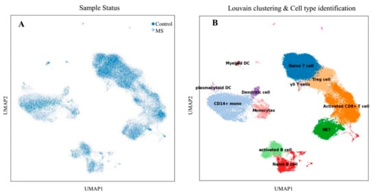 Transcriptomic comparison of MS versus control PBMCs. (A) UMAP projection of cells with the normal situation (n = 17,138) colored in dark blue and cells from MS samples (n = 25,831) were visualized in light blue. (B) Louvain clustering and cell annotation was employed to identify 12 specific cell populations.