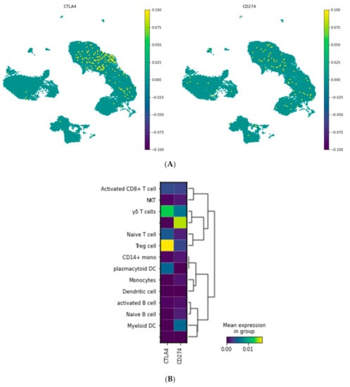 CTLA-4 and PD-L1 (CD274) expression in the different cell populations of PBMCS. (A) Embedding of the graph in two dimensions using UMAP; (B) MatrixPlot shows the CTLA-4 and PD-L1 expression in the diverse cell populations. As is shown, CTLA-4 is mainly expressed in Treg cells and gamma delta T cells, while PD-L1 is not expressed in a specific cell type.