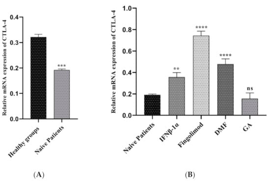 The relative expression of CTLA-4 between MS patients and controls; (A) healthy groups and naïve RRMS patients, (B) naïve RRMS patients and Fingolimod-, DMF-, GA-, and IFNβ-1α-treated patients (** p ≤ 0.01. *** p ≤ 0.001. **** P ≤ 0.0001. ns: not significant).