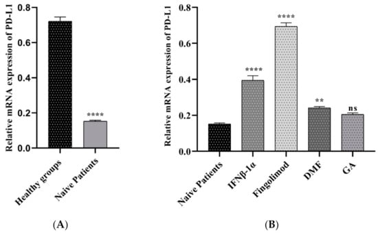The relative expressions of PD-L1 mRNAs in PBMCs between MS patients and controls; (A) healthy groups and naïve RRMS patients, (B) naïve RRMS patients and Fingolimod-, DMF-, GA-, and IFNβ-1α-treated patients (** p ≤ 0.01. **** p ≤ 0.0001. ns: not significant).