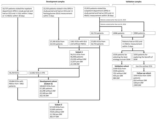 We used a series of methods to collect more samples for developing DLMs. The remaining 16,733 patients first visited after 1 January 2016 had 27,855 ECGs with corresponding HbA1c in the OPD. For further increasing the data volume, we included ECGs without corresponding HbA1c but with corresponding fasting glucose (GLU) within 3 days. A previous study developed an equation for estimating average GLU as follows: 28.7 × HbA1C—46.7 [36], and we used the inverse function to calculate the estimated HbA1c. This method increased to 1261 ECGs with corresponding GLU and without HbA1c from 16,733 patients with more than 1 ECG and GLU pair. Further, 27,395 ECGs with estimated HbA1c from the other 22,533 patients in study period were collected. Therefore, a total of 56,511 ECGs from 46,448 patients were used to construct subset-1 with only OPD data included. To further augment the development samples, 10,737 patients who visited the inpatient department (IPD) were included in the study period, with 36,250 ECGs and corresponding HbA1c within 30 days or estimated HbA1c within 3 days. There were 12,062 IPD ECGs from the 46,448 patients in subset-1 using the same criteria, and there were 104,823 ECGs from 57,185 patients in the subset-2. We further excluded the ECGs without corresponding HbA1c to construct subset-3 with the remaining 57,539 ECGs from 22,695 patients. We defined the subset-2 as the major development cohort. There were 32,298 (30.8%) patients without DM, 22,695 (21.3%) patients with the history of prediabetes and the duration of 0.88 ± 1.91 years, and 50,176 (47.9%) patients with history of DM and the duration of 4.33 ± 4.07 years.