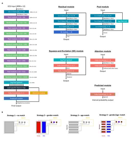 The implementation of our deep learning model. (A) The model architectures of the deep learning model for analyzing ECG. (B) Four training strategies were based on different sampling processes. The matching strategy was to split the sample to multiple blocks based on different conditions. The batch samples were sampled from each block with the same probability.