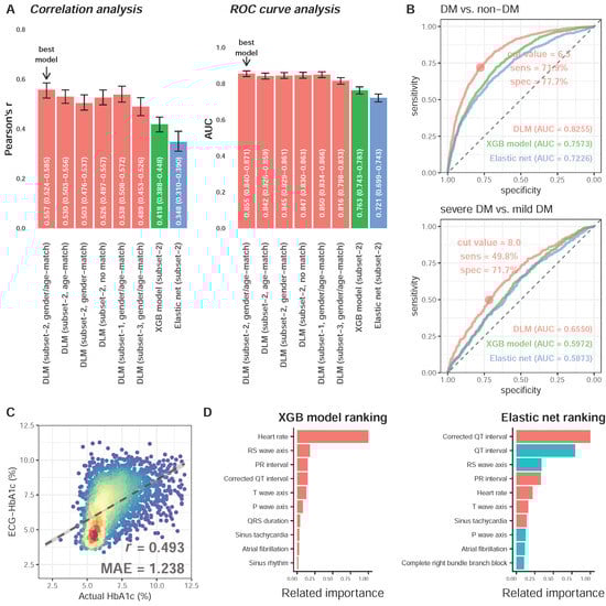 Several ECG manifestations have been proposed as a means of determining diabetic disease status. Diabetic rats exhibited prolonged ventricular depolarization time, decreased conduction velocity, and increased arrhythmia during reperfusion, which are reflected in ECG [40]. In human studies, increased resting heart rate [41] and longer atrial conduction time [42] were found to be correlated with DM. Long-term impaired fasting glucose was also observed to lead to accelerated RHR, ST-T changes, and arrhythmias in ECG [43]. Our data demonstrates that heart rate, corrected QT interval, QT interval, and RS wave axis were the most important ECG changes in the prediction of Lab-HbA1c during big data analysis. However, the detection of DM by ECG is difficult. DLM has been found to extract features unrecognizable to humans, such as obtaining cardiovascular risk factors from the retinal fundus [44], contributing to better performance than that of XGB models and elastic nets.