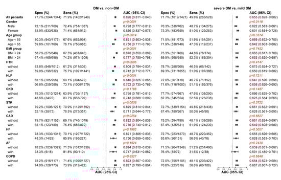 Figure 4 shows that DLM performance was strong across all conditions to detect DM. The strengths of association, albeit widely inconsistent in different conditions for DM detection, were much higher for female and younger patients with fewer co-morbidities (HTN, HLP, and STK) and low BMI. The DLM exhibits higher AUCs with higher specificities in health patients, which indicated that patients with complex co-morbidities were more likely to be recognized as DM by ECG-HbA1c. This implied that patients with normal ECG-HbA1c but abnormal Lab-HbA1c (false negative) were young and healthy, while patients with abnormal ECG-HbA1c but normal Lab-HbA1c (false positive) were elderly with co-morbidities. Intriguingly, these patient characteristics had no impacts on the performance difference of severe DM detection.