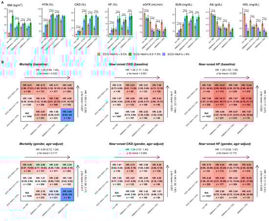 Characteristics and risk analysis in patients with actual HbA1c and ECG-HbA1c. (A) Patient characteristics in different ECG-HbA1c groups and real HbA1c groups. Bars represent the mean or proportion where appropriate and corresponding 95% conference intervals, which are adjusted by real HbA1c in each group via linear or logistic regression. Significant tests are based on the trend test (*: p for trend < 0.05; **: p for trend <0.01; ***: p for trend <0.001), and the sign represents the correlation direction. (B) Risk matrixes of ECG-HbA1c and HbA1c groups on DM related complications. The hazard ratios (HRs) are based on a Cox proportional hazard model before and after adjusting by gender and age. The color gradient represents the risk of corresponding group.