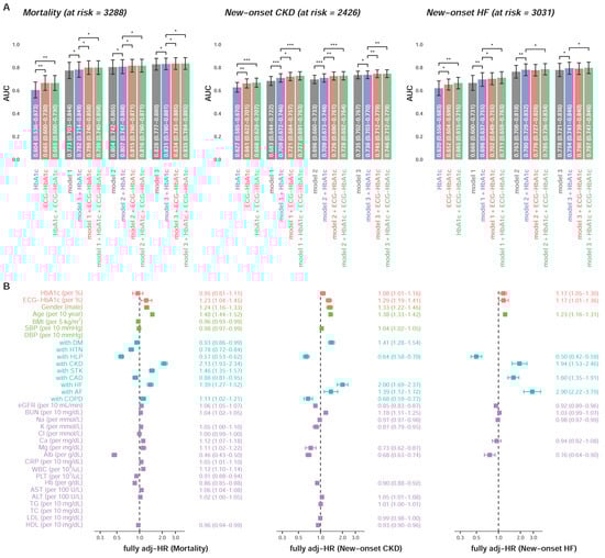 Additional contributions of ECG-HbA1c on DM related complications. (A) A Cox proportional hazard model and C-index are used as the performance assessment for a series of models. The model 1 includes significant demographic data, the model 2 includes variables in model 1 and additional significant disease histories, and the model 3 includes variables in model 2 and additional significant laboratory tests. Abbreviations: *, p < 0.05; **, p < 0.01; ***, p < 0.001. (B) The multivariable analyses of the models with best performance (model 3 + HbA1c + ECG-HbA1c) described above. The risk score can be calculated based on these coefficients to provide the corresponding C-index as above.