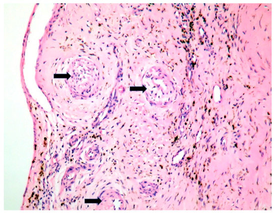 Patients with C. burnetii endocarditis may not develop an efficient cellular response against the microorganism [23]. Multinucleated giant cells in Q fever endocarditis, as in our patient (Figure 4 and Figure 7), suggest an inefficient response to the bacterium [23]. Interleukin-10 (IL-10) impairs the inactivation of C. burnetii in macrophages [39]. Pre-existing valvular and vascular diseases, immunocompromised status, as well as genetic determinants in innate immunity, favor C. burnetii persistence [40].