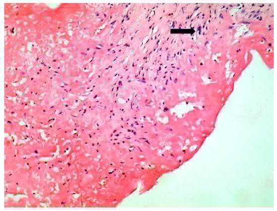 Tricuspid valve endocarditis; a multinucleated cell (arrow) within the mild inflammation at the vegetation base (arrow) (HE stain × 10).
