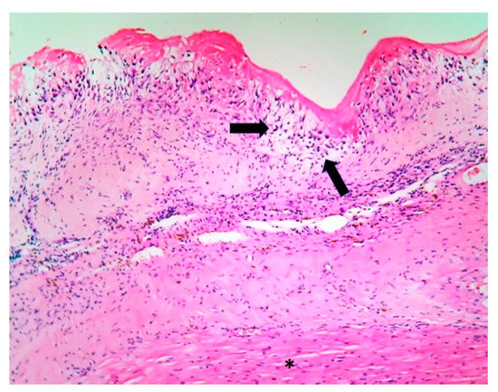 Endomyocardial fragment with mural endocarditis (the asterisk marks the myocardium), giant and foamy cells (arrows). * Special stains did not identify microorganisms (HE stain × 10).