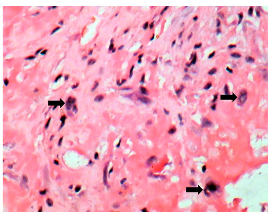 Giant cells (arrows) (HE stain × 40).