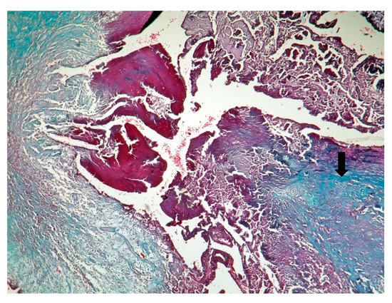 Fibrosis involving the valve and a part of the vegetation- arrow (Tricrom Masson stain × 5).