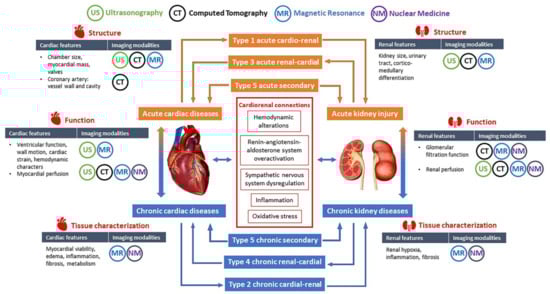 Despite the existing literature on the classification and management of CRS, the clinical diagnosis and treatment evaluation remains difficult due to the lack of clinical practice guidelines [8]. This has led to increased research interests, including studies focused on the early diagnosis and clinical management of CRS. The potential value of imaging biomarkers for the early detection of cardiac abnormalities in CRS has been underlined in the scientific statement from the American Heart Association [8]. Ultrasonography is currently the first-line imaging modality for structural and functional assessment of the heart, and structural assessment of the kidneys. Computed tomography (CT), nuclear imaging, and magnetic resonance imaging (MRI) have been widely used for various purposes in clinical management of cardiovascular diseases and kidney diseases. Recent technological advancements in medical imaging provides a number of promising biomarkers for the diagnosis and prognosis of CRS, and opportunities for personalized medicine. In this review, we will summarize the cardiovascular and renal imaging techniques related to CRS and the potential utility of these techniques for the diagnosis and follow-up of acute and chronic CRS (Figure 1). Finally, comprehensive imaging protocols that can be incorporated into future research studies and clinical trials will be proposed.