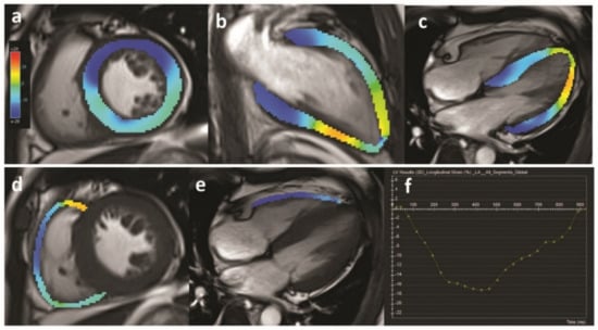 Example of myocardial strain analysis using MRI in a patient with CKD. Quantification of left ventricular strain (a–c) and right ventricular strain (d,e) parameter is visualized by colored overlay on cine images. (f) is an example of strain–time curve of the left ventricular global longitudinal strain within one cardiac cycle.