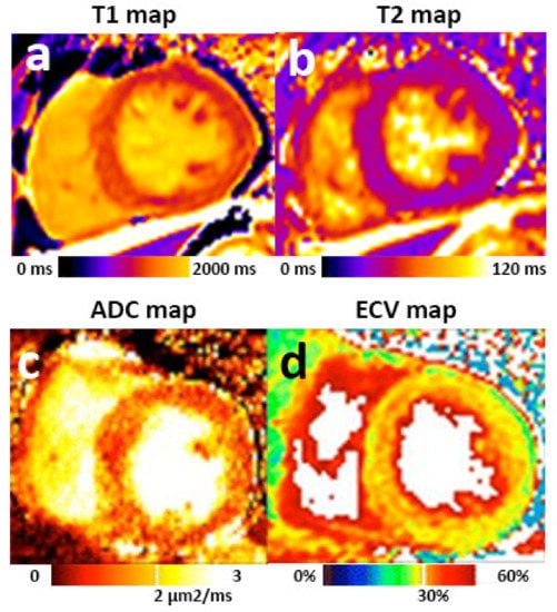 Myocardial tissue characterization by multiparametric MRI. Mid-cavity short-axis T1 map (a) and T2 map (b) of a patient with CKD. Myocardial T1 and T2 values can be quantified and compared with local references. ADC (c) and ECV (d) images demonstrated diffused “pepper like” hyper intensity texture in a patient with hypertrophic cardiomyopathy. Images (c,d) were adapted from published article [52] under a Creative Commons license.