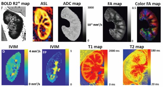 Initial applications of renal MRI have been focused on the visualization of renal and urogenital anatomy. Conventional renal MRI sequences can be used to measure total kidney volume, which is an FDA-approved prognostic biomarker [70], with higher accuracy compared with sonography. Recent research interest has been focused on the application of sequences that provide functional (BOLD, ASL) and microstructural (DWI, DTI, T1 mapping, T2 mapping) information without the need for gadolinium-based contrast agents [71,72,73,74,75] (Figure 4).