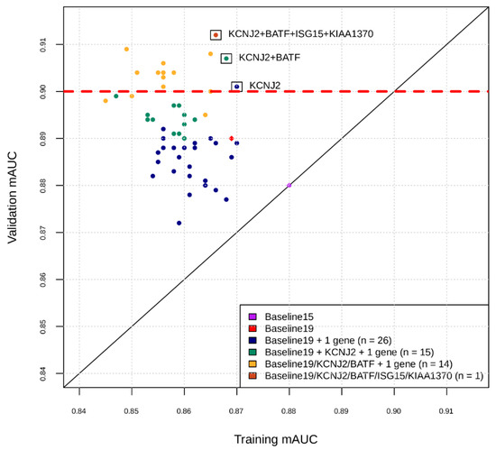 Intermediate snapshot of the Phase II of the marker selection by machine learning. X-axis is the cross-validation AUC in training for best model found by Bayesian Hyperparameter Optimization using features comprising current marker set plus one marker at a time. Y-axis is the AUC of that model applied to validation set. For example, the blue dots represent training and validation AUCs for feature sets consisting of the 19 markers found in Phase I, plus one of the markers in the remaining set of markers. KCNJ2 was added to current marker set and the process repeated for the remaining set of markers (green dots), etc.