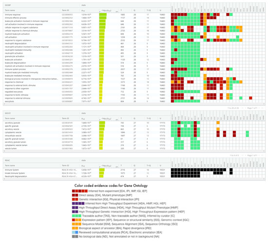 Three terms in Reactome analysis were found significant (all with FDR < 0.0005): immune system, innate immune system, and neutrophil degranulation due to contributions of 18, 13, and 9 members respectively from the 29 input genes as shown in Figure 2. Marginally significant ones (not shown) with contributing members ranging from 2 to 4 include trafficking and processing of endosomal toll-like receptor (TLR), collagen degradation, TLR cascades, interferon alpha/beta signaling, CD163 mediating anti-inflammatory response, cytokine signaling in immune system, MHC class II antigen presentation, degradation of the extracellular matrix, extracellular matrix organization, interferon signaling, all relevant to immune response.
