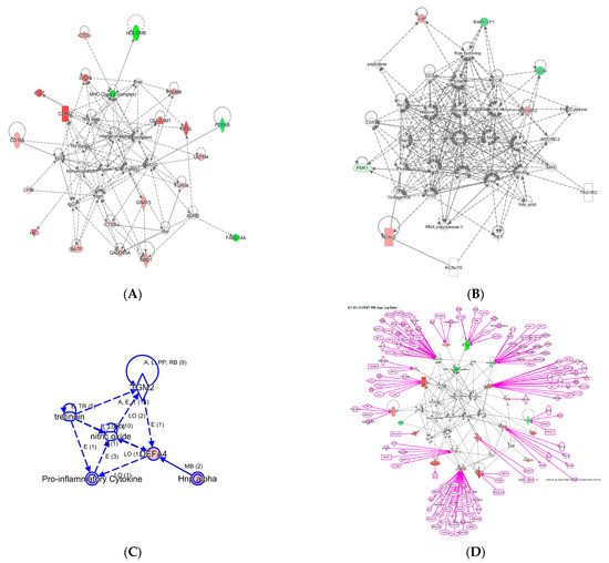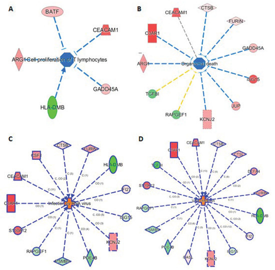 Network A has a total of 35 nodes; of the 29 InSep genes, 20 are found in this network, either over-expressed (red) or under-expressed (green) in viral infection in comparison with uninfected controls. Top diseases and functions involved in this network include immunological disease, inflammatory response, and organism injury and abnormalities. The first one is the MHC class II molecules, found on antigen-presenting cells. As MHC class II protein complex is encoded by the human leukocyte antigen complex (HLA), HLA-DMB is under-expressed in both viral and bacterial infection, but by a greater magnitude in bacterial than viral infection. CSTL(Cathepsin L) is involved in MHC-mediated antigen processing and presentation, also shown in the network. In addition, CTSL plays a major role in intracellular protein catabolism. Its substrates include collagen and elastin, as well as alpha-1 protease inhibitor, a major controlling element of neutrophil elastase activity. CTSL is also known to be associated with Middle East Respiratory Syndrome and bacterial infections in CF airways. The second key driver is IFN beta as well as IFN alpha (interferon type I) for upregulating the expression of IFI27, with greater magnitude in viral than in bacterial infection; type I interferons are produced by fibroblasts and monocytes when a viral infection is recognized [87]. C3AR1, Complement C3a Receptor 1, is impacted by several pathways and is upregulated by MHC class II, type I interferons, interleukin 12 complex, immunoglobulin G, and TNF via various mechanisms.