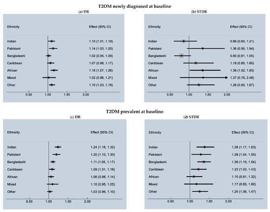 Among people with newly diagnosed T2DM, Indian, Pakistani, African and ‘Other’ ethnic groups had significantly higher risk of DR compared to White ethnic groups with African having the highest risk (HR: 1.16 95% CI 1.07–1.26) (Figure 2a). However, in relation to STDR, only Africans (HR: 1.36; 95% CI 1.02–1.83) showed an increased risk compared to White ethnic groups (Figure 2b).