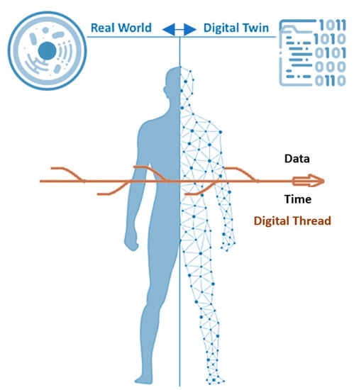 A digital thread is a digital twin’s temporal data pipeline (i.e., data pipeline over time), e.g., from a person’s or cell’s birth to death, or from, say, 2010 to 2030 for a given population, enabling tracing and tracking, asking questions, and the discovery of useful relations between various data elements over time (Figure 1).