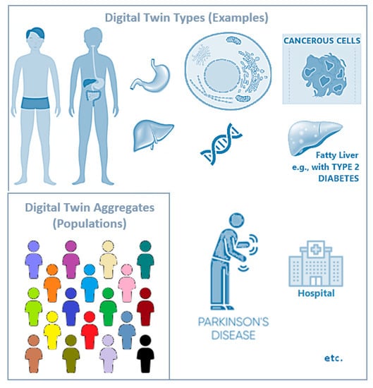 Different digital twin types can be conceived (Figure 2); for example, one can have twins of whole human body, or of just one body system or body function (e.g., digestive system/function), of a single body organ (e.g., liver), or of finer body component levels (e.g., cellular, subcellular (organelle/sub-organelle), or molecular levels). Digital twins can also be created for a specific disease or disorder (represented under one or more of the aforementioned types; for example, a diseased body organ, e.g., liver with non-alcoholic fatty liver disease), or for other relevant organisms (e.g., a virus, interacting with one of the previous human digital twin types). Composite digital twins integrate two or more of the above-mentioned types, while reference digital twins or proto-twins serve as templates or archetypes for building more complex, individualised digital twins of each type.