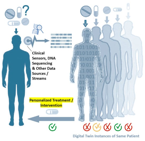 Digital twin instances of the same person or patient can be used for in silico testing and comparison of different treatment or preventive intervention possibilities to find out which option will work best for that particular individual. Note the data flow from clinical sensors, DNA (deoxyribonucleic acid) sequencing, and other data sources and streams to the digital domain.