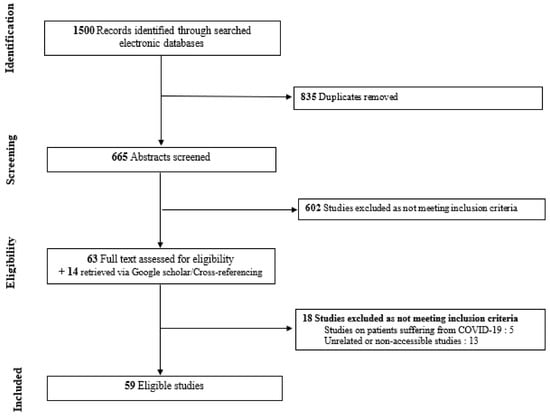 Literature search identified 665 articles that were screened for eligibility after removing duplicates. Among the articles retrieved, 59 met our eligibility criteria. The PRISMA flowchart for the inclusion of studies in the review is shown in Figure 1. They were then categorized according to their relation to either (i) the mental health effects based on DSM-5 [] symptomatology (k = 34:14 editorials/commentaries, 2 case reports, 9 cross-sectional/survey-based studies, 6 longitudinal studies, 3 reviews) or (ii) the therapeutic effects (k = 35:18 editorials/commentaries, 7 cross-sectional/survey-based studies, 5 longitudinal studies, 5 reviews) of the COVID-19 pandemic on individuals with NCD. A few studies pertaining to both these objectives were included in both categories. Concerning diagnoses provided by the included data-driven articles pertaining to mental health effects, 10 studies were conducted on people living with dementia (PLWD) in general, 2 were specifically conducted on individuals with Alzheimer’s disease (AD) and 4 included patients suffering from dementia or mild cognitive impairment (MCI). As for evidence-based literature provided from data-driven studies pertaining to therapeutic effects, 11 studies were conducted on PLWD in general, 2 were specifically conducted on individuals with AD, 1 was conducted on individuals solely suffering from MCI and 3 included patients suffering from dementia or MCI.