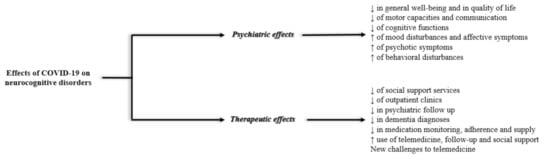 COVID-19 has had many public health impacts especially on more vulnerable individuals, including older adults with NCD. Overall, although preliminary, this systematic review showed (i) a significant deterioration in the symptoms regarding several spheres (i.e., overall symptoms and well-being, cognitive symptoms, affective symptoms, behavioral symptoms and psychotic symptoms); and (ii) important therapeutic changes induced by the pandemic, as it brought challenges in standard care and social support services, which were mainly palliated with the growth of telemedicine.
