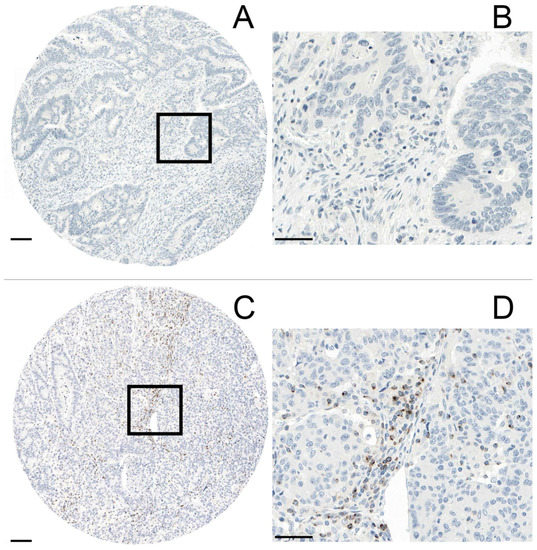 All TMA cores for each individual case were evaluated for the presence or absence of LAG-3 immunohistochemical staining (G.R). Consistent with Sobottka et al., LAG-3 expression on TILs within both the tumor front and tumor center was dichotomously scored as either positive or negative [19]. Representative images are outlined in Figure 1A–D. LAG-3 positivity on TILs was defined as membranous staining of any intensity regardless of the number of LAG-3 positive immune cells (≥1), whereas the absence of any staining was determined as LAG-3 negative. We reported the scores for LAG-3 positive TILs as absolute numbers and used the maximum score of all analyzed tissue cores from each patient. The tumor front was defined as the area where the most advancing cancer cells reached the edge of the tumor. In a control set of normal, non-neoplastic colon tissues, no LAG-3 positivity could be observed. Mismatch repair deficiency (dMMR) was defined as the loss of nuclear expression of at least one of the four MMR proteins (MLH1, MSH2, MSH6 and PMS2) in the tumor cells in the presence of an internal positive control such as lymphocytes, normal epithelium or fibroblasts in the close vicinity of the tumor. Focal weak and dotted nuclear staining were considered negative. Retained nuclear expression of all MMR proteins was determined as mismatch repair proficiency (pMMR) [20].