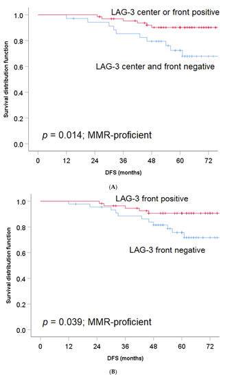 In conclusion, we were able to demonstrate that LAG-3 expression on TILs at the tumor front of stage II colon cancers was associated with better outcomes in both the overall stage II cohort and within the subgroup of stage II MSS tumors. Therefore, LAG-3 might serve as a potential prognostic biomarker. However, further studies are needed to explore whether the assessment of LAG-3 in stage II colon cancer may help us to identify those patients who derive the most benefit from adjuvant chemotherapy.