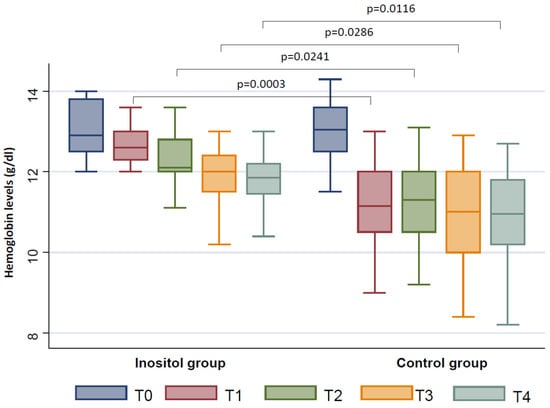 Changes from baseline in hemoglobin levels between the Inositol Group and the Control Group during the follow-up (T1–T4).