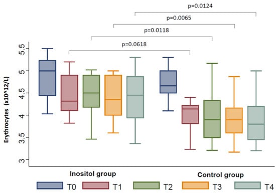 Changes from baseline in erythrocytes between the Inositol Group and the Control Group during the follow-up (T1–T4).
