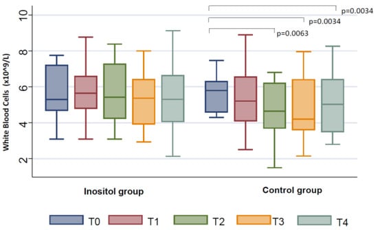 Changes from baseline in white blood cells between the Inositol Group and Control Group during the follow-up (T1–T4).