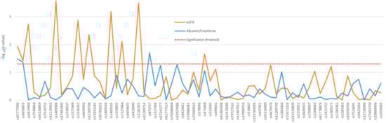 The influence of the 89 SNPs on the renal function of the 430 nephrosclerosis patients who were not in dialysis was analyzed adjusting by sex, age, ethnicity, hypertension, diabetes, and CKD stage. Ten variants in PTGER3, mainly located in the proximal region of the gene, showed a significant association with eGFR, with p values ranging from 0.0003 to 0.038 (Figure 1). Associations with the albumin-to-creatinine ratio were far less noticeable and also only observed in PTGER3 (Figure 1). The two first variants in the gene, rs61777096 and rs6656853, were the only ones to significantly affect both eGFR and proteinuria. Mean eGFR and albuminuria values displayed by the patients with significant differences between genotypes are shown in Supplementary Table S2.