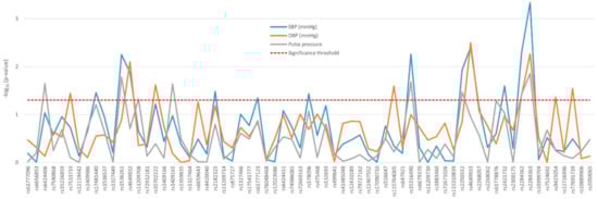 Except for PTGER4 rs16870224, all the variants found to affect blood pressure traits—namely, systolic (SBP) and diastolic blood pressure (DBP) and pulse pressure—were located in PTGER3, mostly in a distal area of the gene (Figure 2). Supplementary Table S3 shows the differences across genotypes observed in the nephrosclerosis patients. Most notably, two consecutive tag-SNPs, rs2284362 and rs2284363 were found to significantly decrease SBP (p = 0.005 and p = 0.0005, respectively), DBP (p = 0.039 and p = 0.005), and pulse pressure values (p = 0.038 and 0.014, Figure 2).