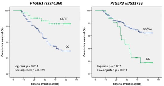 In order to narrow down the number of SNPs to be analyzed in the survival study, we carried out a previous analysis of the crude association of the 89 variants with the risk of experiencing a CV event under the selected genetic model. Five SNPs resulted in significant associations, with the rs7533733 GG genotype displaying the highest OR and the lowest p value (OR = 2.65 (1.28–5.46), p = 0.01, Table 5). Kaplan–Meier analysis of these five polymorphisms revealed that carriers of the PTGER1 rs2241360 T variant allele had better CV event-free survival than homozygous wild-type carriers did (log-rank p = 0.014), whilst patients homozygous for the PTGER3 rs7533733 G variant allele experienced more events than AA/AG carriers (log-rank p = 0.007, Figure 3). After adjusting these results in a Cox regression model accounting for other confounding variables (see Supplementary Table S4 for details), the differences between genotypes in both SNPs remained statistically significant (p = 0.029 and 0.011, respectively).