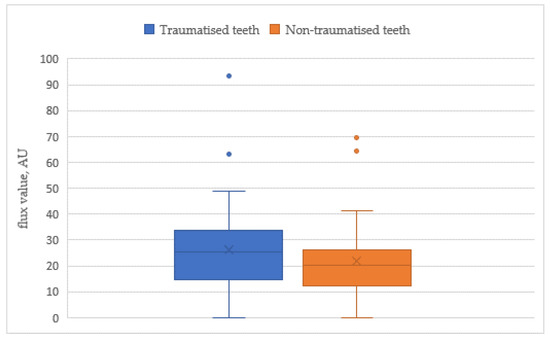 Flux value (AU) of traumatised and non-traumatised teeth.