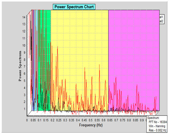 Graphical visualisation of the LDF recording information. A power spectrum density (PSD) graph is displayed. The graph was divided into frequency bands for statistical analysis of the bands. Two parallel measurements of both traumatised and non-traumatised teeth are presented. Each channel was plotted individually (Canal 1, in black, non-traumatised and Canal 2, in red, traumatised teeth).