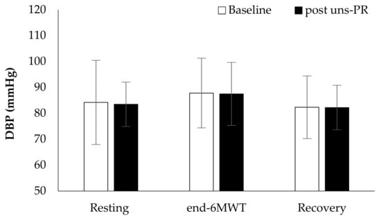 Diastolic blood pressure alteration during 6 MWT before and after PR.