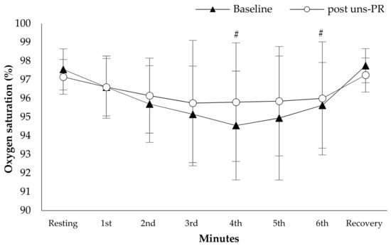 Oxygen saturation alteration during 6 MWT before and after PR. # p < 0.05.