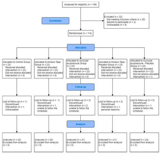 The sample consisted of 114 participants who were randomly allocated to a control group, a kinesio-tape group, a placebo kinesio-tape group, an auricular-acupressure group and a placebo auricular-acupressure group (Figure 1). Details of the intervention following the Template for Intervention Description and Replication (TIDieR) [32] guidelines are provided in Supplemental Materials Table S1.