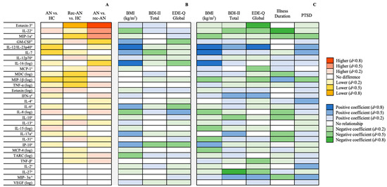 (A) Between-group differences in inflammatory marker concentrations after controlling for age, ethnicity, smoking status and use of psychopharmacological medications, stratified by effect size. (B) Associations between clinical characteristics and log10-transformed inflammatory markers in the whole sample (n = 131) after controlling for covariates, stratified by effect size. (C) Associations between clinical characteristics and log10-transformed inflammatory markers in the anorexia nervosa group (n = 56) after controlling for covariates, stratified by effect size. a Analysed by nonparametric analysis of covariance (Quade’s method). Abbreviations: AN = anorexia nervosa; BDI = Beck Depression Inventory; EDE-Q = Eating Disorders Examination Questionnaire; HC = healthy control; IFN = interferon; IL = interleukin; IP = interferon γ-induced protein; MCP = monocyte chemoattractant protein; MDC = macrophage-derived chemokine; MIP = macrophage inflammatory protein; rec-AN = recovered AN; TARC = thymus and activation-regulated chemokine; TNF = tumour necrosis factor; VEGF = vascular endothelial growth factor.