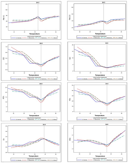 Figure 1 shows a graph of relationship among air pollutants and temperature; in most graphs, the curve of the normal group was lower than the other three chronic lung diseases groups. In the graphs of CO, NO, NO2, NOx and SO2, there was a V/U-shaped curve between temperature and air pollutants. When the temperature was at the lowest or highest, the concentrations of these air pollutants were at the highest, but at around 24.3–24.9 °C (optimum temperature), their concentrations were the lowest. However, the findings for O3 were the opposite, and at the highest or lowest temperature, the O3 concentration was the lowest, whereas at around 24.9 °C the concentration was the highest. In addition, the concentrations of PM2.5 and PM10 elevated with increasing temperature.