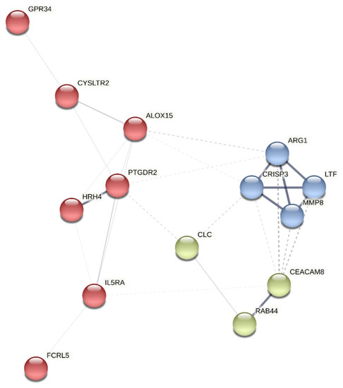A protein-protein interaction network analysis was performed on the selected genes using the K-means [33] clustering method with STRING (Search Tool for the Retrieval of Interacting Genes/Protein) [34] to identify clusters within them. The approach yields three clusters: A, B, and C (Figure 1). PTGDR2 was found in cluster A, enriched in proteins involved in immunological processes such as HRH4, ALOX15, CYSLTR2, GPR34, IL5Rα, and FCRL5 (Figure 1) (Table 3).