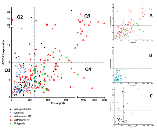 Scatter plot of the linear relationship of PTGDR2 expression and peripheral eosinophil counts (left panel). Comparison among asthma patients with and without polyposis, simple polyposis, allergic rhinitis, and controls are shown. (Panels A–C) show the main groups independently. Four quadrants were obtained by dividing according to a positivity cutoff of 250 eosinophils cells/µL (Specificity > 95%) and a cutoff of 9.3-fold difference for PTGDR2 expression (Specificity >95%): Q1 (EO < 250 cells/µL; PTGDR2 < 9.4-fold); Q2 (EO < 250 cells/µL; PTGDR2 > 9.3-fold); Q3 (EO > 250 cells/µL; PTGDR2 > 94-fold); Q4 (EO > 250 cells/µL; PTGDR2 < 9.3-fold).