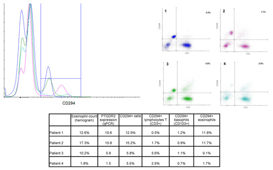 Overlay histogram and dot plots from 4 selected patients. Left panel: Overlay histogram showing CD294+ cells in all 4 patients. Right panel: Dot plot of CD3-CD294 labeling, percentages of the right upper quadrant (CD3+CD294+ cells) are shown. Color code was kept in both graphs. Lower table: Percentage of the different CD294+ cell population in comparison to eosinophil counts and PTGDR2 expression for the selected four patients.