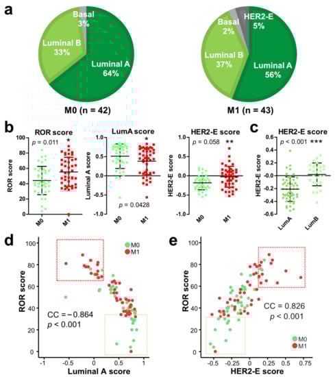 Molecular subtypes in premenopausal breast cancer patients with (M1) and without (M0) subsequent metastasis. (a) Proportion of patients in M0 and M1 groups with the indicated molecular subtypes. (b) Comparison of Luminal A, HER2-E, and ROR scores between M0 and M1 groups. *, p < 0.05, **, p < 0.01, ***, p < 0.001. (c) Comparison of HER2-E score between Luminal A (LumA) and Luminal B (LumB) groups. (d,e) Correlation of ROR score and Luminal A (d) or HER2-E (e) score. CC, Spearman correlation coefficient. p values are indicated.