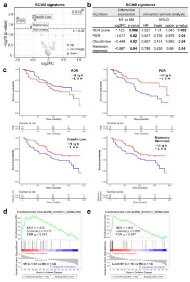 BC360 signatures differentially expressed in M0 vs. M1 are associated with survival. (a) Volcano plot of differentially expressed BC360 signatures. Log2 FC, Log2 fold change. Cutoff: p-value = 0.05. (b) Univariate survival analysis (calculated with Cox regression model) of significant BC360 signatures. HR, hazard ratio. CI, confidence interval. (c) Overall survival curves are stratified by the indicated signatures. (d,e) Gene set enrichment analysis (GSEA) results of M0 vs. M1 ((d), all samples) and M0 vs. M1 in Luminal B samples only (e). FDR, false discovery rate, NES, normalized enrichment score.